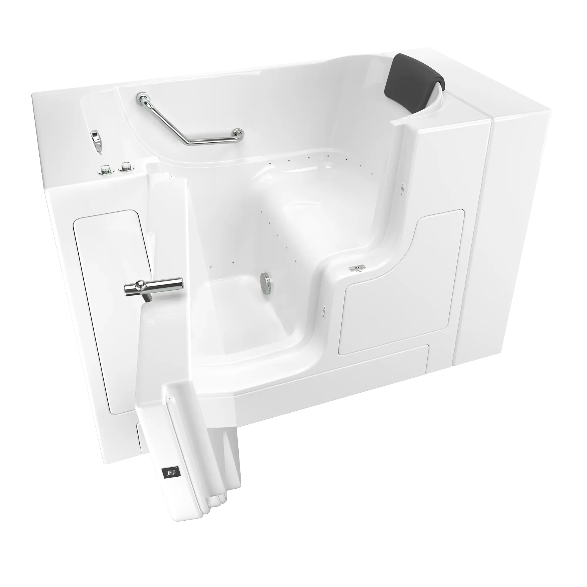 Gelcoat Premium Series 30 in. x 52 in. Outward Opening Door Walk-In Bathtub with Air Spa system fits in smaller spaces and uses less water – the included Extender Kit makes it easy to retrofit in a standard-size bath space. Fully equipped, the Premium Series offers all the latest in safety and comfort features with the most advanced therapeutic option.